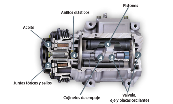 El sistema de aire acondicionado de un coche funciona a través de un ciclo de refrigeración que utiliza un compresor para comprimir el gas refrigerante y aumentar su temperatura. El gas refrigerante se mueve a través de un condensador, que disipa el calor del gas y lo convierte en líquido. El líquido refrigerante se mueve a través de un dispositivo de expansión, que reduce su presión y temperatura, lo que provoca que se evapore en gas. El gas refrigerante en este estado es absorbido por un evaporador que se encuentra en el interior del coche, y en el proceso de evaporación, absorbe el calor del aire que pasa a través del evaporador.